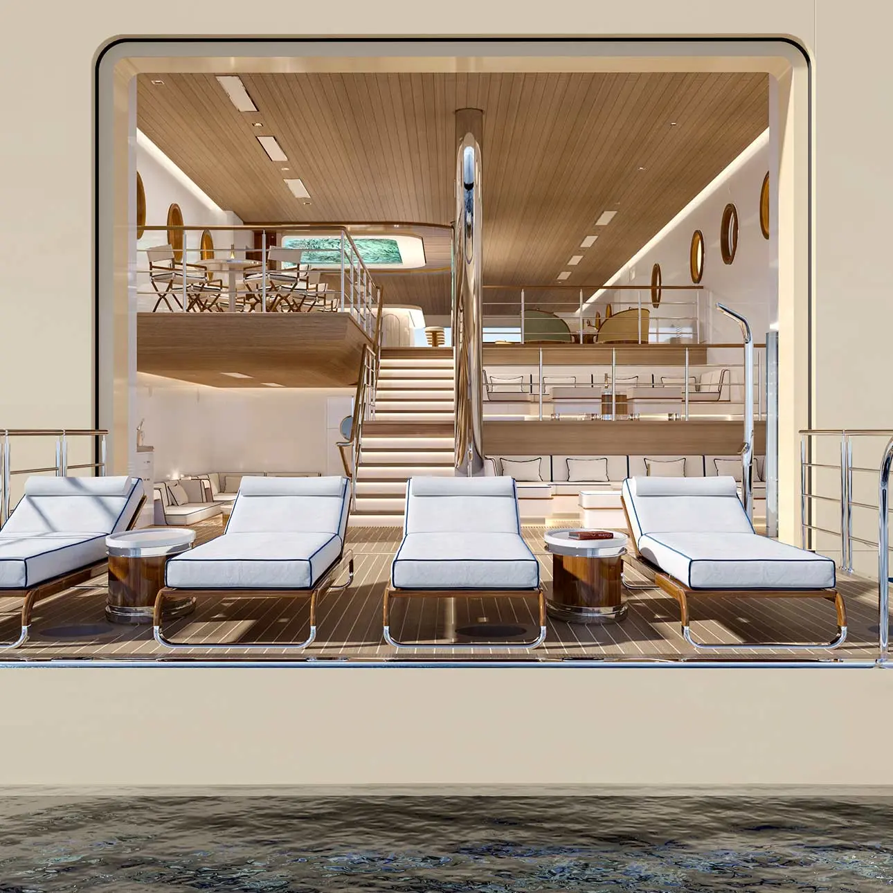 The brand’s hallmarks of ingenuity include its transverse marina in which hydraulic platforms reach out from either side to form floating sun decks, a seawater pool and water-sports access. Two sleek tenders — The Limo Tender and The Beachlander — deliver guests to secret coves and private beach clubs.