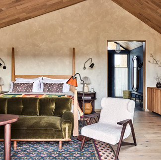 Interiors feature warm woods and handblown glass fixtures, complemented by quilted fabrics and storied fabric-house prints in colors reflecting the seasons—sage and goldenrod, burnt umber and aubergine. Honoring the land, sustainable design measures and materials, including the careful sourcing of vintage pieces, have been incorporated throughout.